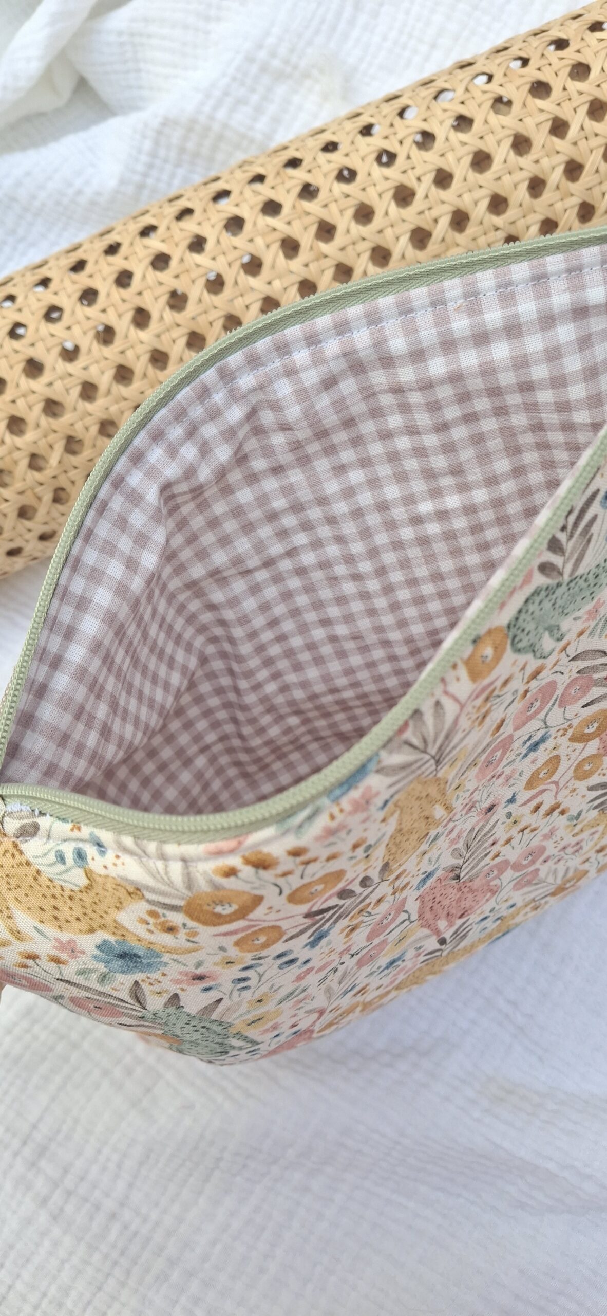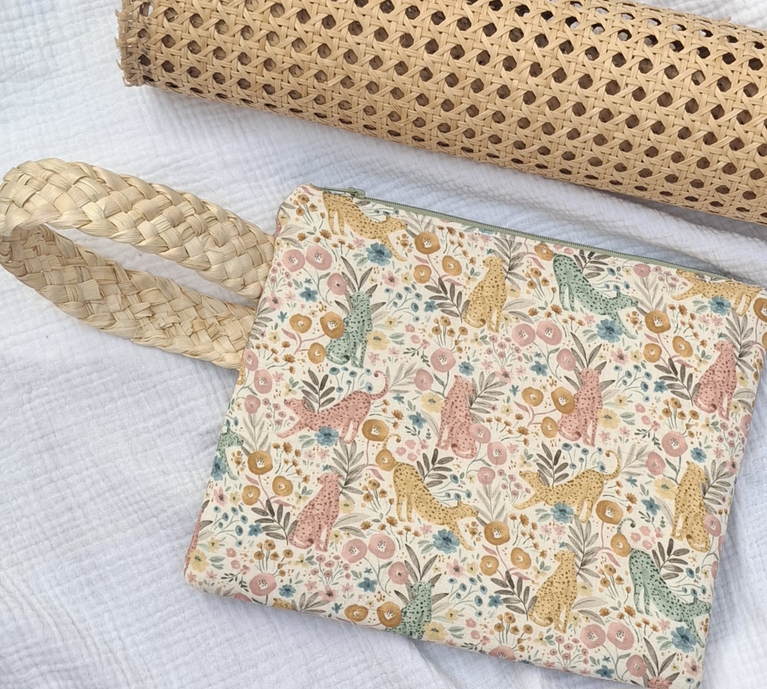 Confeccionado en tela de alta calidad, este bolso destaca por su delicado estampado floral con felinos en tonos suaves, que aporta un aire fresco, elegante y único a cualquier look.