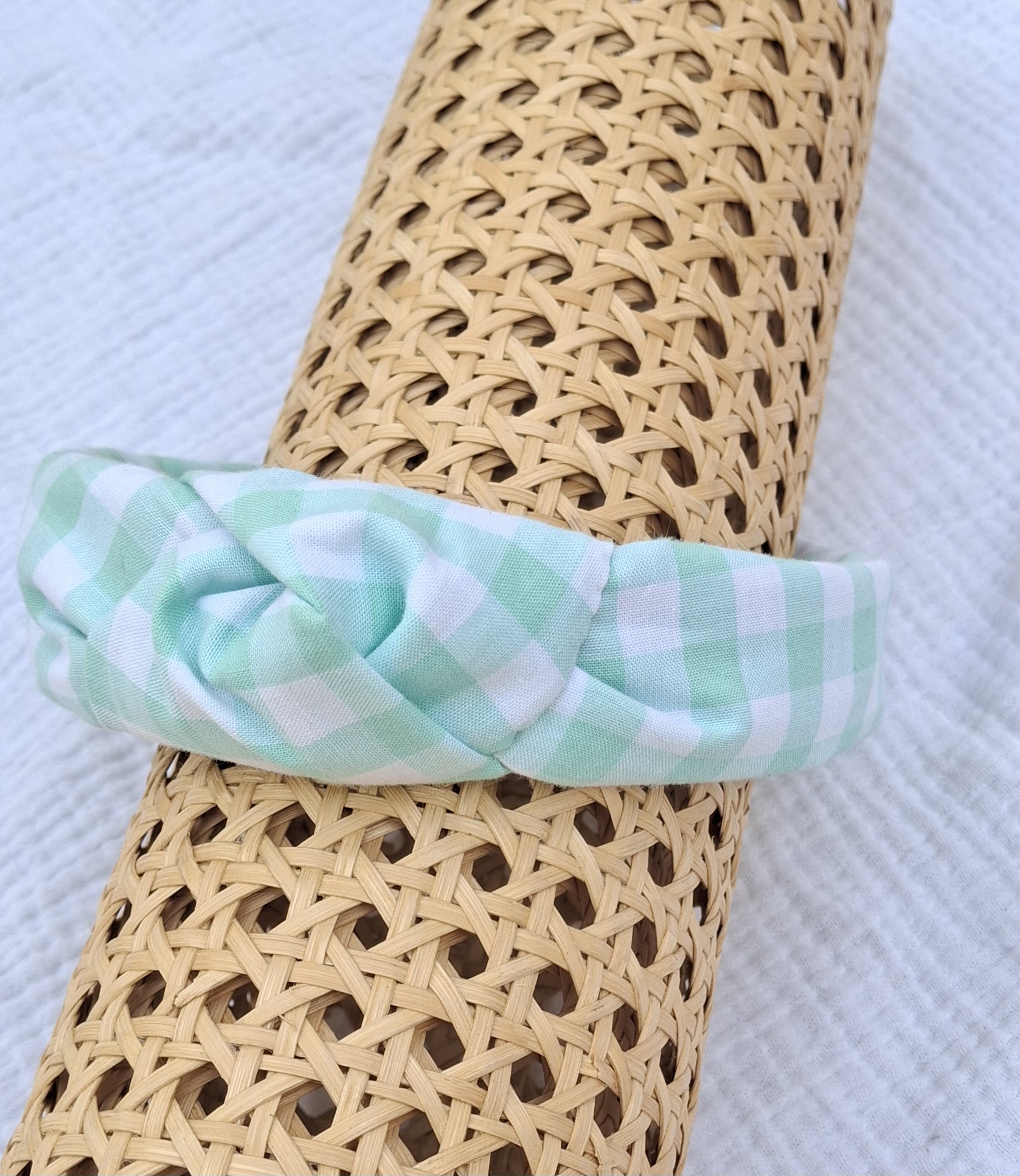 Sutileza, elegancia y diseño atemporal se unen en esta diadema confeccionada en delicado tejido vichy en tono menta. Su nudo central, cuidadosamente estructurado, aporta volumen y carácter, elevando una pieza clásica a un accesorio distintivo.