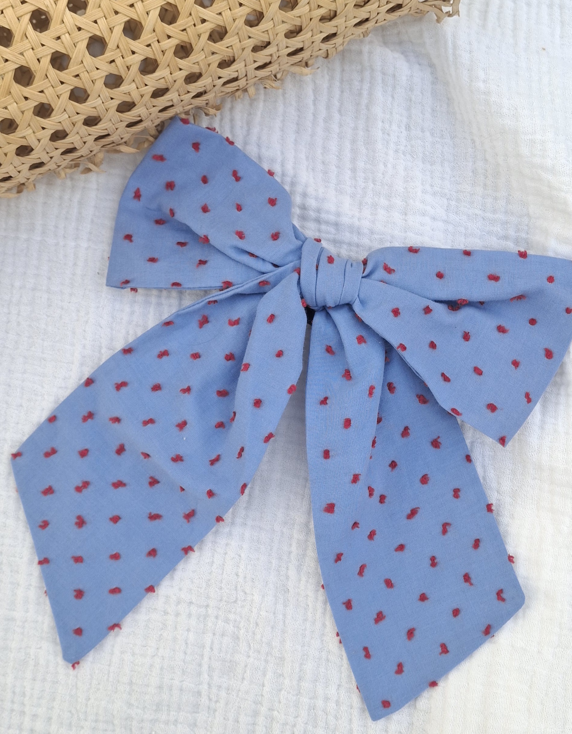 Este modelo de maxi lazo está realizado en plumeti azul y rojo, un estampado básico e imprescindible en nuestro armario.
