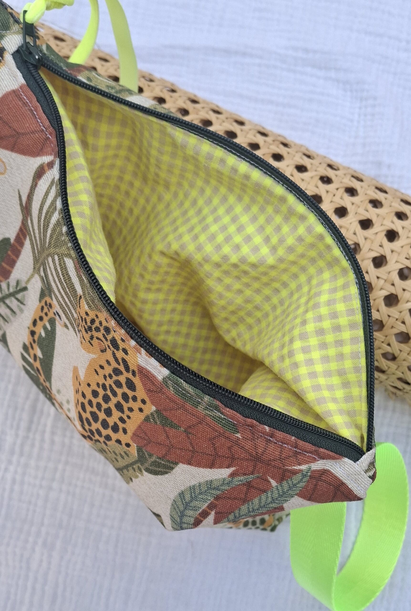 Va forrado al interior con tejido de algodón cienxcien y cierre mediante cremallera.