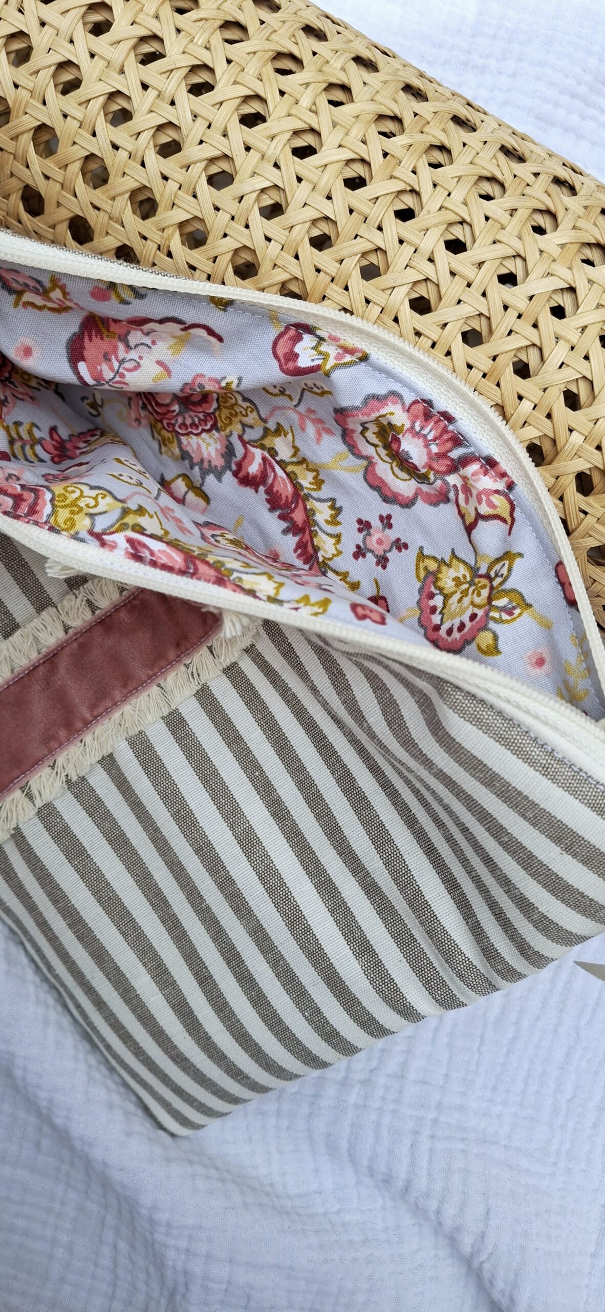 Acolchados, su interior va forrado con telas que combinan a la perfección con el exterior, cierre de cremallera y asa.