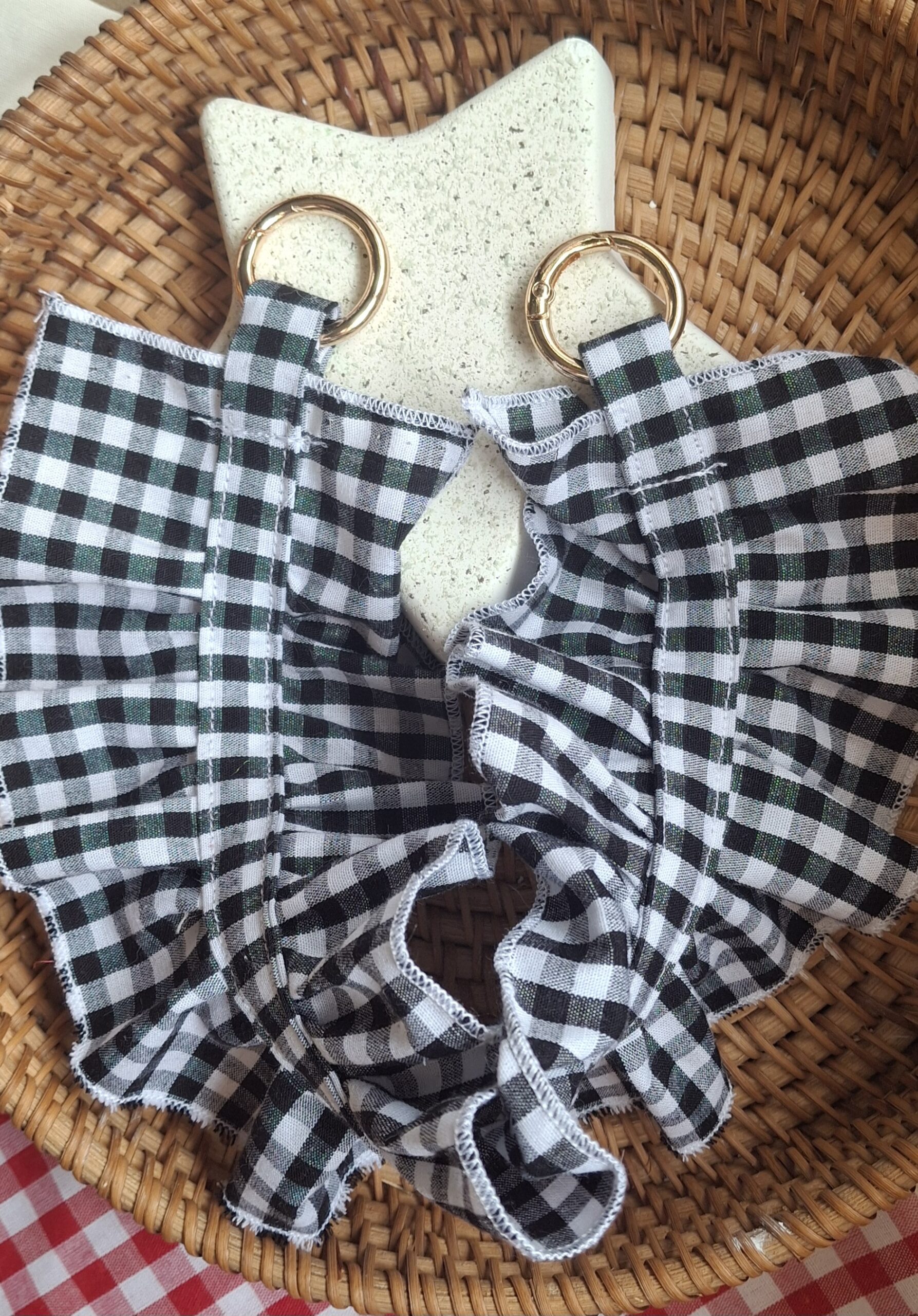 Cuelga móvil corto con volante y anillas doradas.