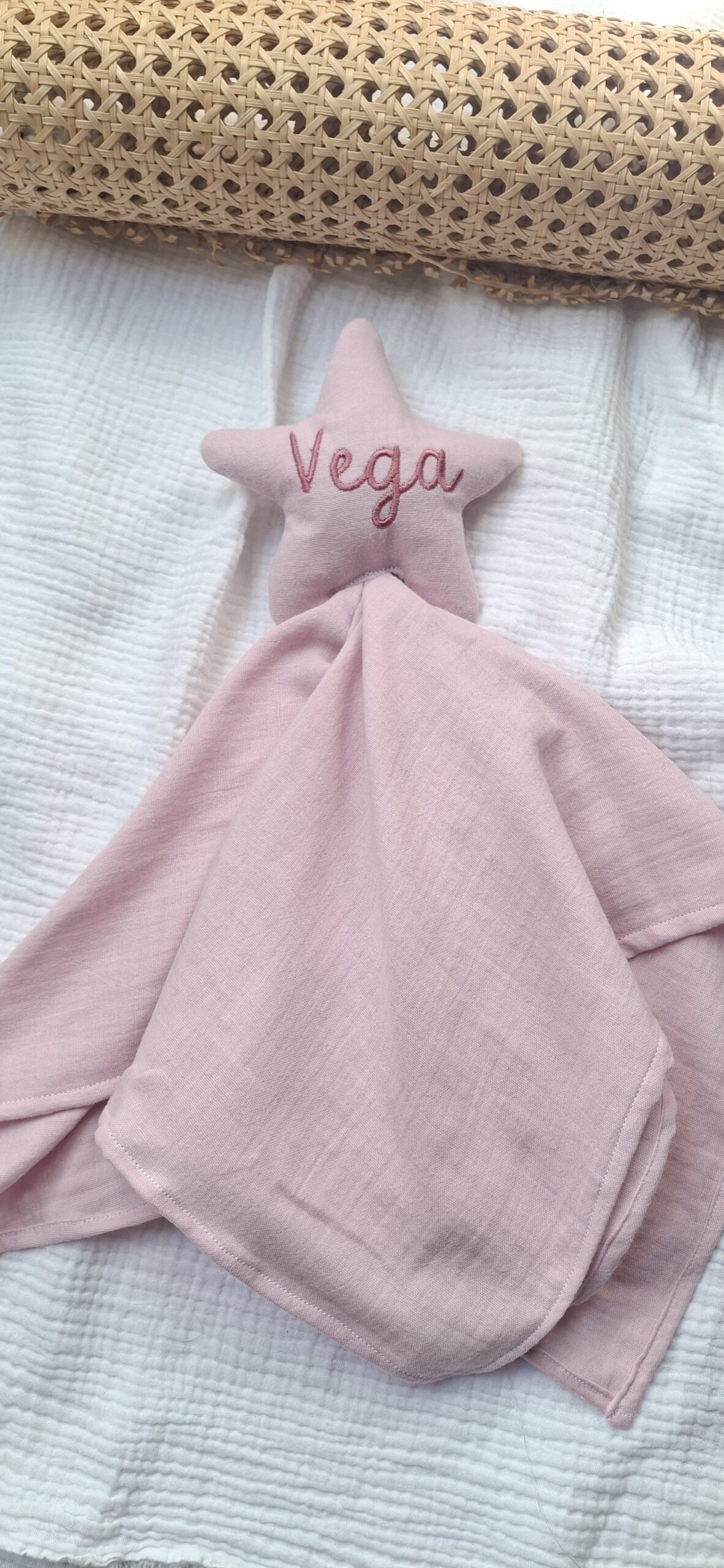 Suave, delicado y lleno de ternura. Este precioso doudou en forma de estrella está confeccionado con tejido de doble gasa de alta calidad, ideal para acompañar a tu bebé desde sus primeros días.