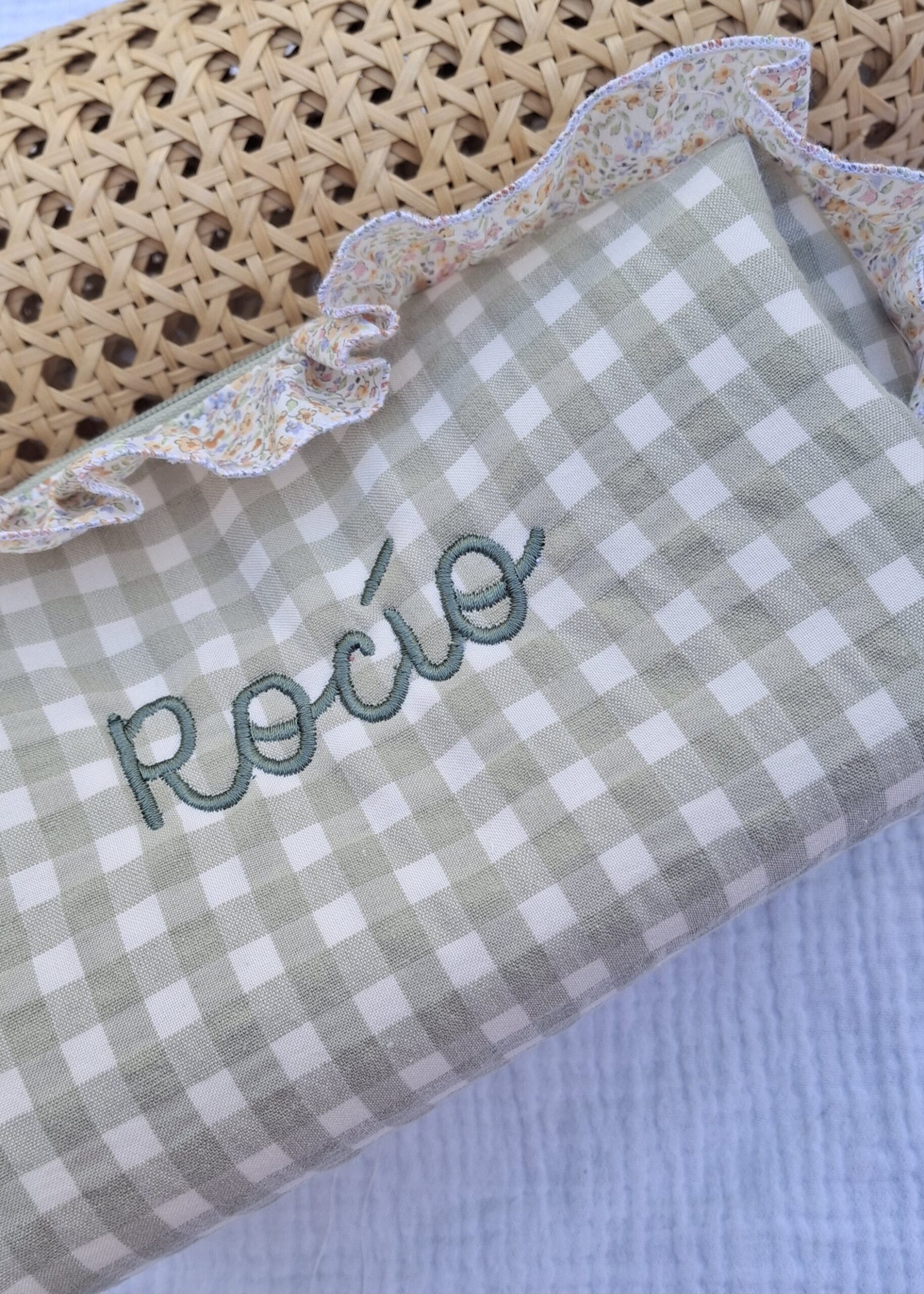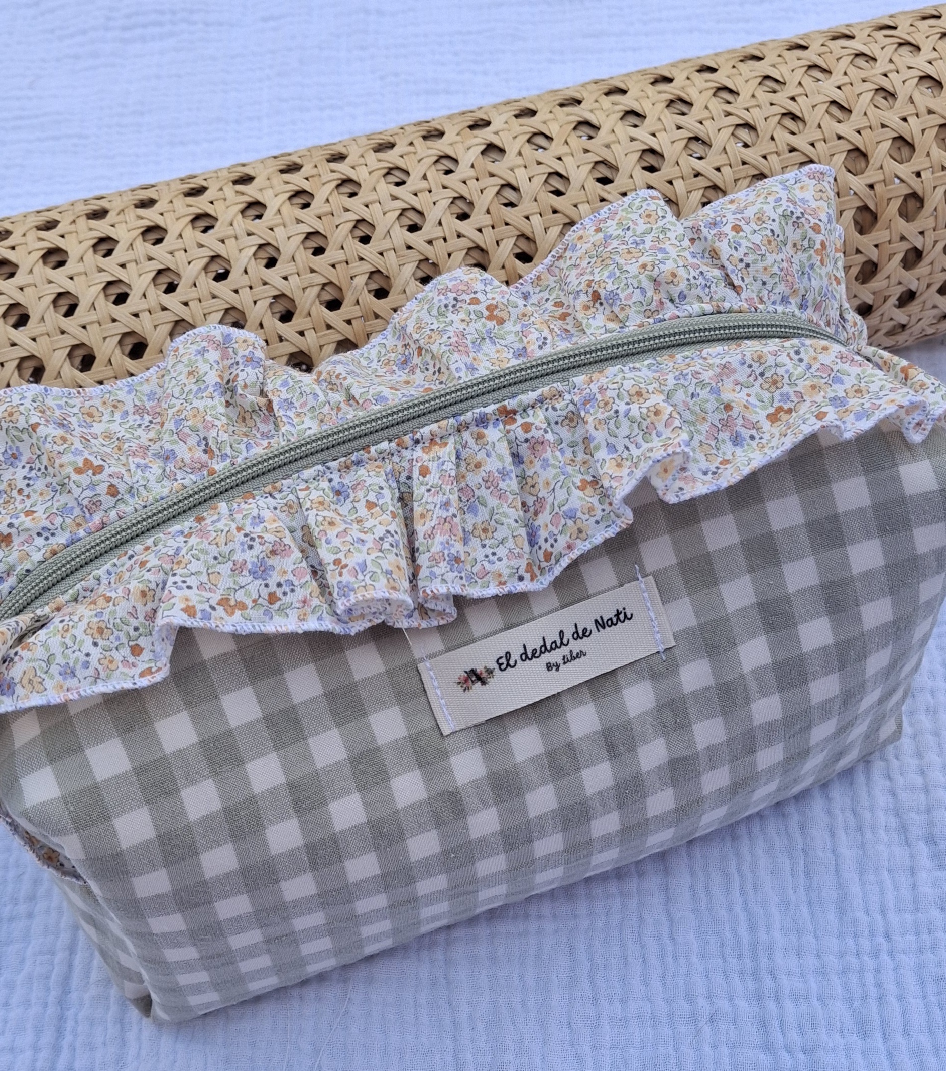 El neceser París, está realizado en vichy verde té, y volante en flores mini de diferentes colores.