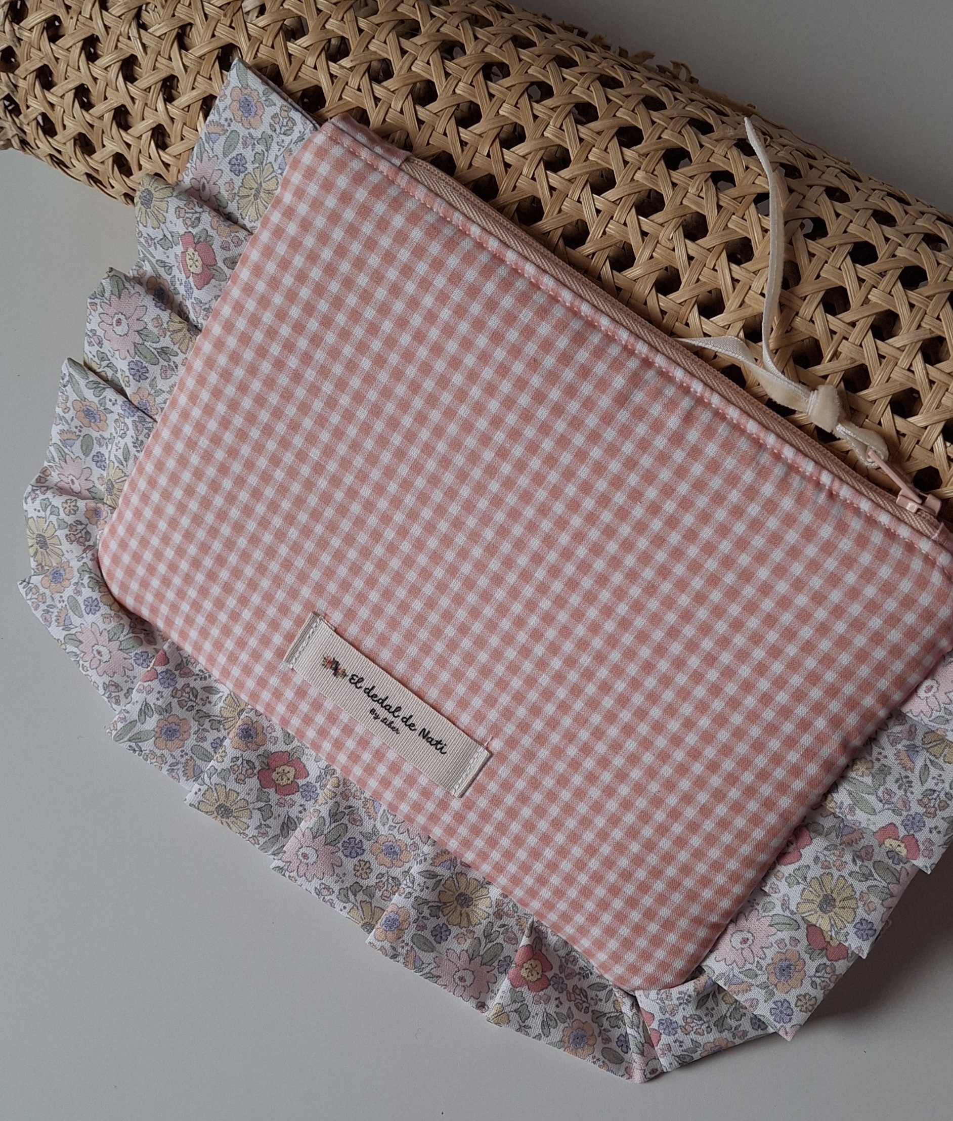 Este modelo, está realizado con dos telas con diferente estampado flores en diferentes tonos y vichy mandarina, su interior es de color blanco, guardando así una sintonía de colores que lo hace muy especial para esta nueva temporada.